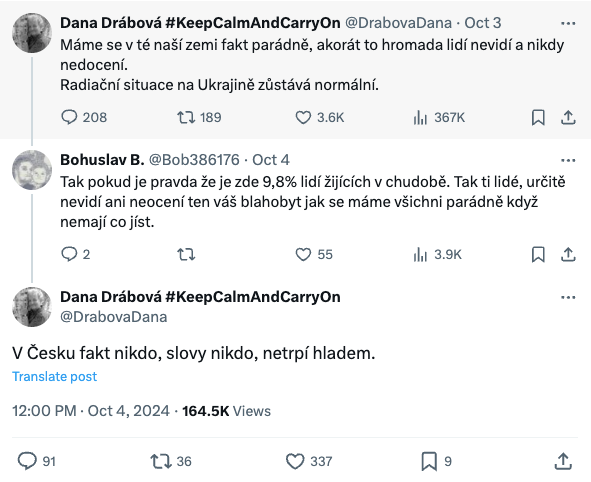 Za zmínku stojí především tweety paní Dany Drábové, protože opravdu vypadají, jako by Marie Antoinette říkala: Let them eat cake. (Což prý nikdy neřekla, ale chápete).