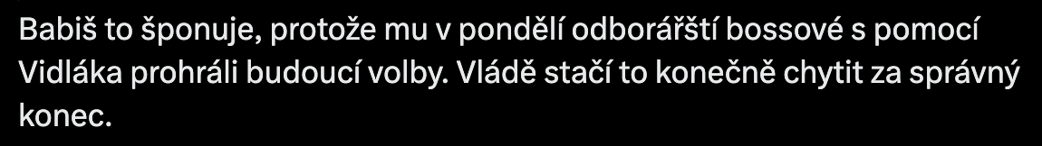 No nevím. Získat 80 křesel, to by byla prohra, jen pokud bychom tu měli systém dvou stran. Pravda, kdyby měl Babiš o šest křesel více, měl by s SPD křehkou většinu 101 a nemusel trpět MotoCirkus. Ale těch 6 křesel je cca 160.000 hlasů, což se nezdá jako moc, ale on už je neměl odkud vzít. Takže ne, odbory s Vidlákem opravdu Babišovi neprohrály volby.